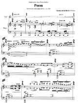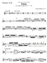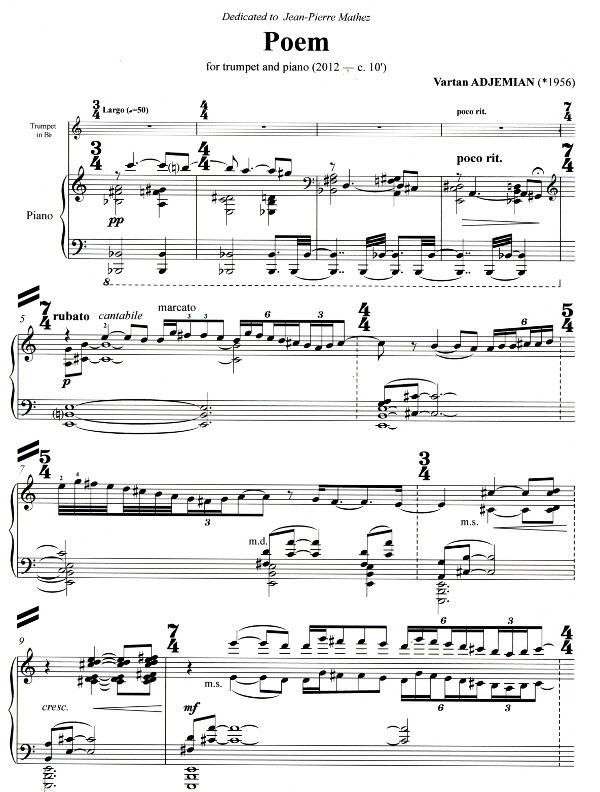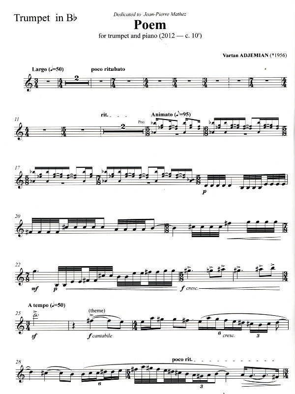 This musical Poem is an epic work with dramatic, mournful cries which Armenian composer Vartan Adjemian wrote in a masterly manner for trumpet and piano. The piano part plays a critical role, creating a haunting sound environment featuring sometimes rhythmical, sometimes amorphous, dense or light harmonic textures, often within the context of a declamatory format, directing the trumpet towards its extreme and idiomatic expressive resources. Poem is a strong work culled from the ancestral Armenian music tradition and enriched by the most modern worldly technical and musical developments.