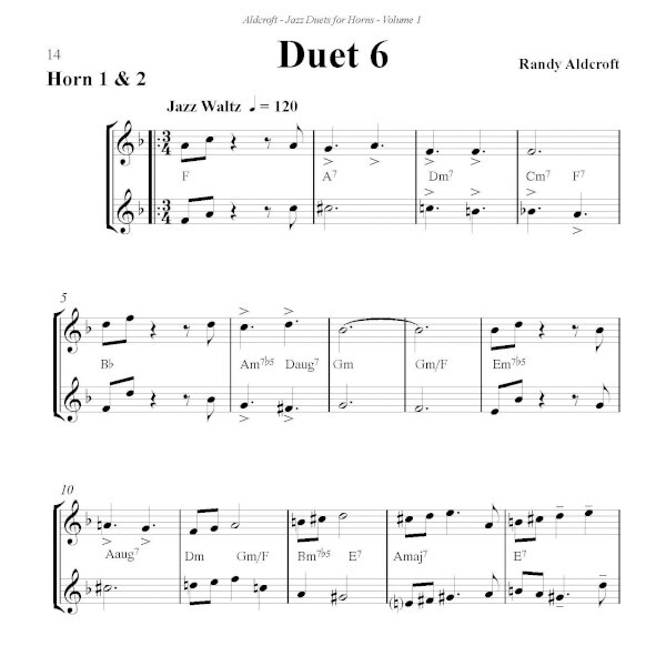 Randy Aldcroft has written three volumes of wonderful Jazz Duets for Horns in all keys. These Duets were written for the intermediate and advanced student interested in playing in a Jazz style. The range of notes gets higher and the duets get harder with each volume.