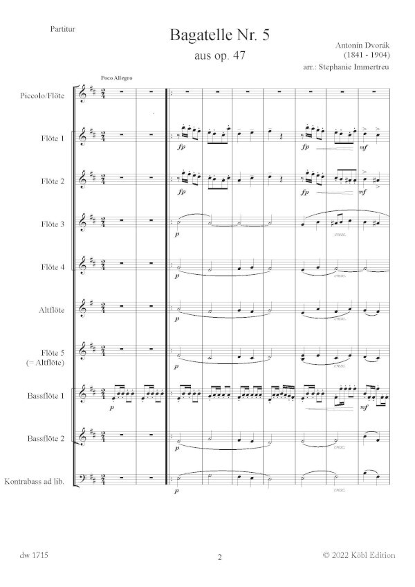 Piccoloflöte, 5 Flöten (5. Flöte alternativ mit Altflöte), Altflöte, 2 Bassflöten & Kontrabass ad libitum