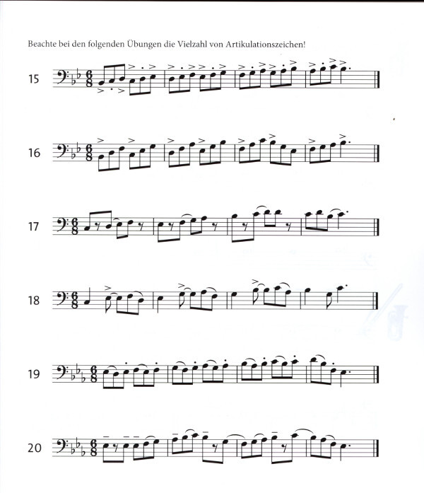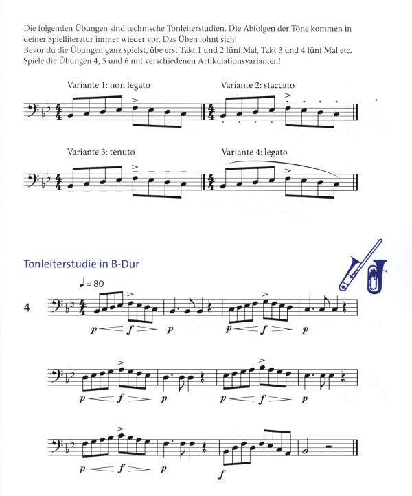 In vier Kapiteln erweitert der zweite Band der Instrumentalschule Fähigkeiten und Fertigkeiten des Posaunen/Euphoniumspiels. Mit der Erarbeitung neuer Tonräume in C-, F-, Es-, As-Dur können neue Stücke und Etüden bewältigt werden, teilweise im Duett oder sogar im Trio. Die Schule besticht durch durchweg praxisorientiertes Arbeiten mit dem Instrument. Neben speziellen Übe- und Gestaltungsmöglichkeiten für Tonleitern wird auch der Dynamik, der Phrasierung, der Atmung und dem Rhythmusgefühl ein großer Raum beigemessen. Musiktheoretische Parameter werden in gewohnter Weise zu Beginn jedes Kapitels behandelt. Spielerisch eingebundene Denkaufgaben fordern den Schüler auf, die Stücke nicht nur abzuspielen, sondern sich bewusst mit ihrem Aufbau und dem Notentext auseinanderzusetzen. Am Ende vieler Kapitel kann der Schüler im Quiz seinen jeweiligen Lernstand überprüfen. Mithilfe der beigelegten CD können Übungstücke und Lieder noch einmal angehört oder im Zusammenspiel geübt werden.