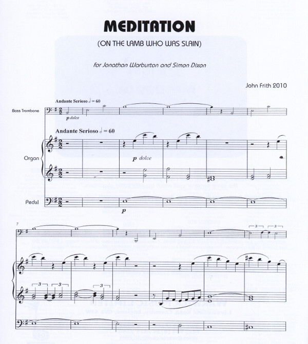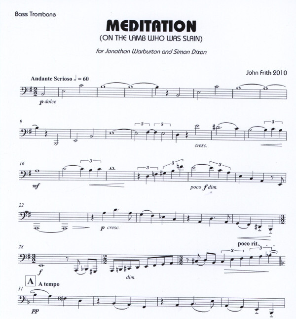 English composer John Frith has written extensively for brass and winds. Meditation for bass trombone and organ was composed for Jonathan Warburton. As the title suggests, the piece begins slow and pensively. The timber of the bass trombone is well complemented by the richness of the organ. The piece travels through several key and meter changes before building in intensity near the end with showering sixteenth-note figures on the organ manuals. n accessible piece, nothing is technically difficult for the bass trombonist; range extends AA-flat-a-flat2. The organ part is not demanding, written on three staves with no registration indicated. This piece is suited for recital and for use in a liturgical setting.
