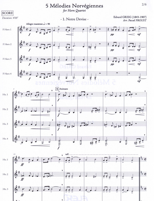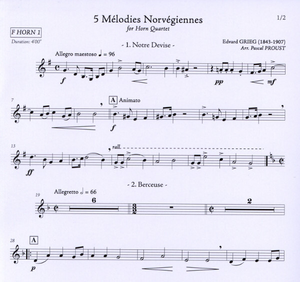Notre Devise Berceuse Chant de la Foret Cjanson des Felurs Chant de Guerre Norvegien 1. Hornstimme bis f" Dauer 4 Minuten