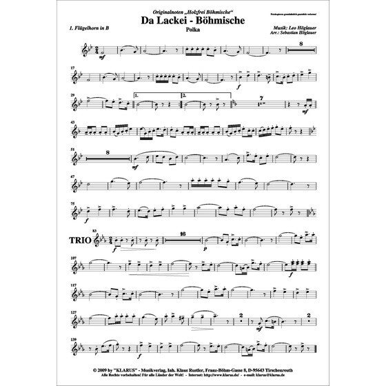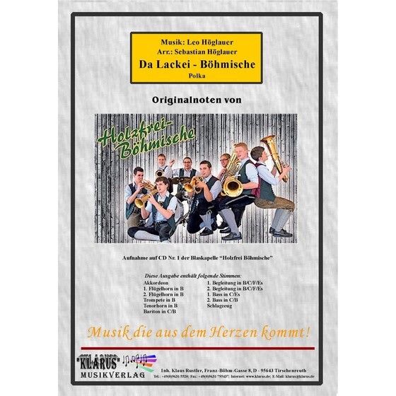 Das Werk "Da Lakei - Böhmische" ist eine Polka von Leo Höglauer, in einem Arrangement von Sebastian Höglauer, in kleiner Besetzung. Spielbar ab Besetzung 1. Flügelhorn, 2. Flügelhorn, Tenorhorn und Bariton. Alle anderen Stimmen können beliebig ergänzt werden bis 7ner Böhmische Besetzung