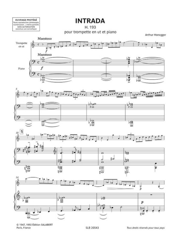 Intrada: from the outset, the title of Arthur Honeggers piece for trumpet and piano is programmatic. Composed in April 1947 for the Concours International dExécution Musicale de Genève [The Geneva International Music Competition], this work refers to the intradae, which functioned as overtures, written for brass instruments during the 16th and 17th centuries. Honeggers use of pentatonic modes throughout the entire piece is equally remarkable and creates an immediately recognisable stylistic unity. Introduction and notes on interpretation in French and English by André Feydy. New engraving.