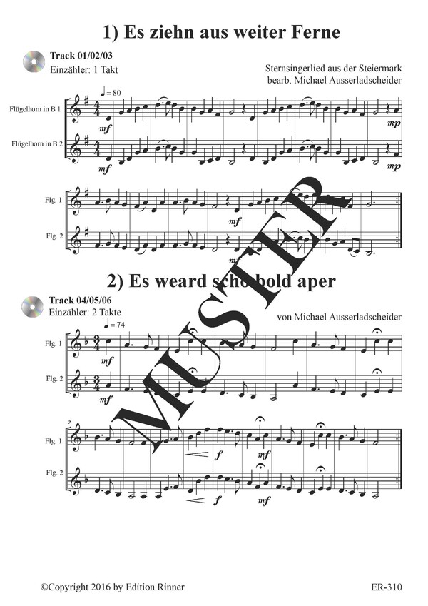 Diese Stücke wurden auf CD eingespielt. Zuerst ist die 2-stimmige Fassung zu hören, die beiden folgenden Tracks mit 1. und 2. Stimme wurden mit Einzähler versehen und sind für das selbstständige Üben hilfreich. Alle Fermaten wurden um einen Schlag verlängert. Somit wird es dem Ausführenden ermöglicht im Eigenstudium die Zweistimmigkeit kennenzulernen.