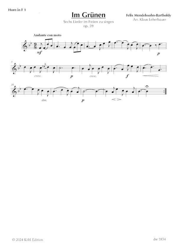 6 wunderschöne Lieder von Felix Mendelssohn-Bartholdy, ideal für Hornquartett,