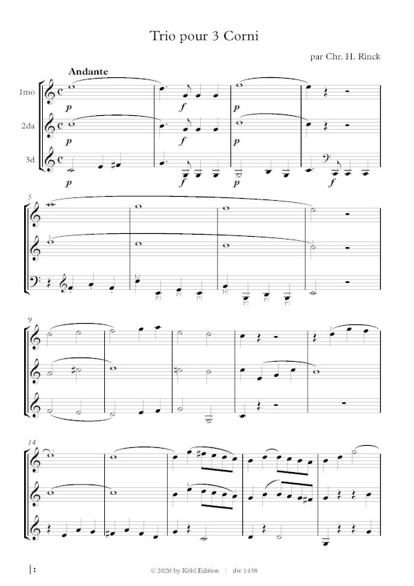 Wieder einmal ist es gelungen, ein Originalwerk der musikalischen Romantik dem Archivschlummer zu entreißen. Das "Trio pour 3 Corni" des heute kaum mehr bekannten Meisters Christian Heinrich Rinck erblickt hier zum ersten Mal das Licht der Öffentlichkeit. Die Urtextausgabe wird das an Originalwerken aus der Romantik nicht eben reich gesegnete Repertoire des Horntrios sicher bereichern.