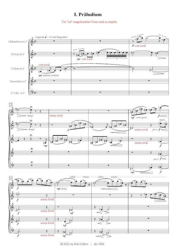 Idee dieser Stücke ist die Verwendung der feinen klanglichen Differenzen, die sehr wohl zwischen den heutigen zahlreichen Waldhorntypen bestehen. Da es für das hohe F-Horn keine passenden Dämpfer gibt, wird es einem guten Hornisten nicht schwerfallen, die wenigen gedämpften Töne auf einem kleinen Dämpfer mit evtl. entsprechenden Hilfsgriffen sauber herauszufinden. Gleichzeitig machte es mir Vergnügen, den tuben-begeisterten Hornisten (wohl erstmalig) eine kammermusikalische