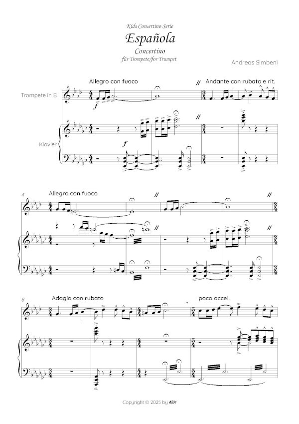 A Young Soloist in the Spotlight: Kids Concertino Series Española - Concertino for Trumpet and Piano or Wind Orchestra In the magical world of music, there is nothing more inspiring than the sound of a young, talented soloist performing with a band. The Kids Concertino Series offers younger artists a unique opportunity to showcase their skills to an enthusiastic audience while highlighting the beauty of their instrument. In this concert, the soloist takes a journey to fiery Spain. Lets celebrate the talents of the next generation and give them the opportunity to conquer the stages of the world! The future of music is in their hands, and every performance is a step toward a bright musical future. Un