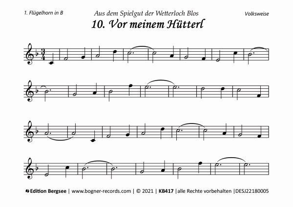 1. Flügelhorn in B, 2. Flügelhorn in B, Posaune in B, Tuba in C, Zusatzstimmen: Bariton in C, 2. Bariton in B, 2. Bariton in C, Horn in F 8 Hefte A6 quer