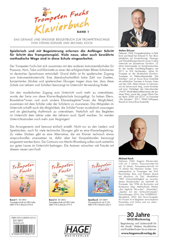 Das Klavieheft zu band 1 der Trompeten Fuchs Schule von Stefan Dünser Der Trompeten Fuchs hat sich zusammen mit den anderen Instrumentalschulen fur Posaune, Horn, Tuba und Klarinette zu einer der erfolgreichsten Bläser-Schulserien im deutschen Sprachraum entwickelt. Grund dafur ist ihr spielerischer Zugang zum Instrumentalunterricht. Eine uberdurchschnittlich hohe Zahl von Duetten, konzertanten Stucken und spielerischen Übungen tragen dazu bei, dass diese Schule von Lehrern und Schulern bevorzugt im Unterricht Verwendung findet.