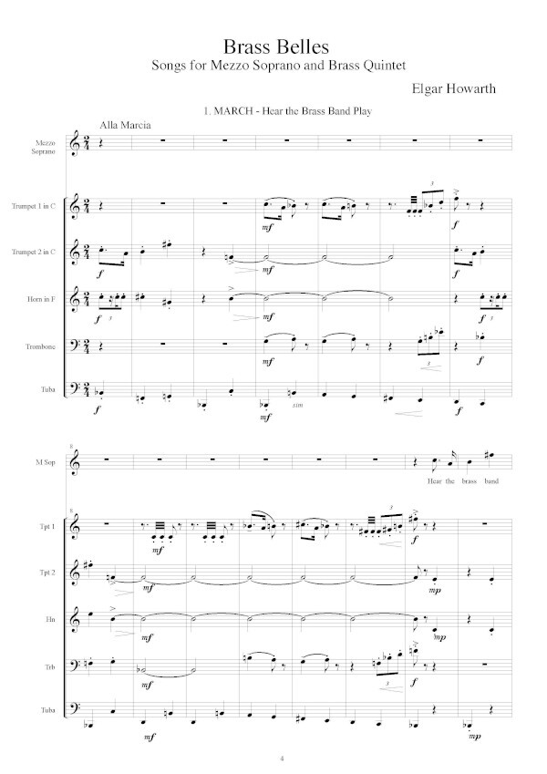 These songs for Mezzo-soprano and brass quintet were written for Mary Thomas and the Philip Jones Brass Quintet. They were performed on British television in a bandstand set and with players in bandsmen's uniform. After the quirky opening march each instrument is featured: the trombone in a slow blues, the horn in an increasingly virtuosic duel rather than a duet, the trumpets in a gently flowing meditation and the tuba in a comic waltz. The set finishes with a reprise of the opening march. Performance note: