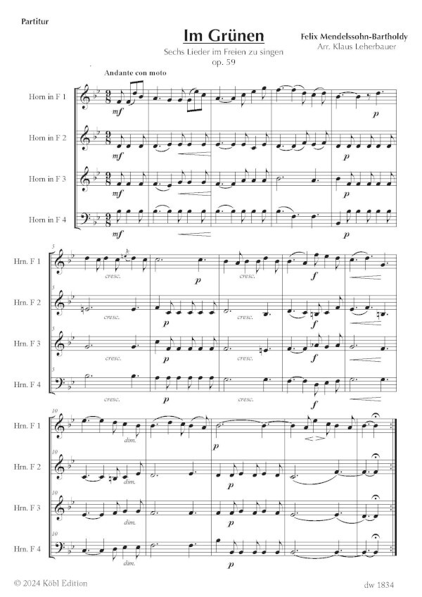 6 wunderschöne Lieder von Felix Mendelssohn-Bartholdy, ideal für Hornquartett,
