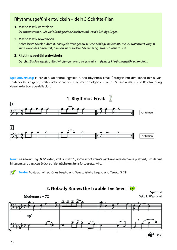 Zahlreiche Stücke, Duette, Rhythmusübungen und Tonleiterstücke mit praxisnahen Spielanweisungen